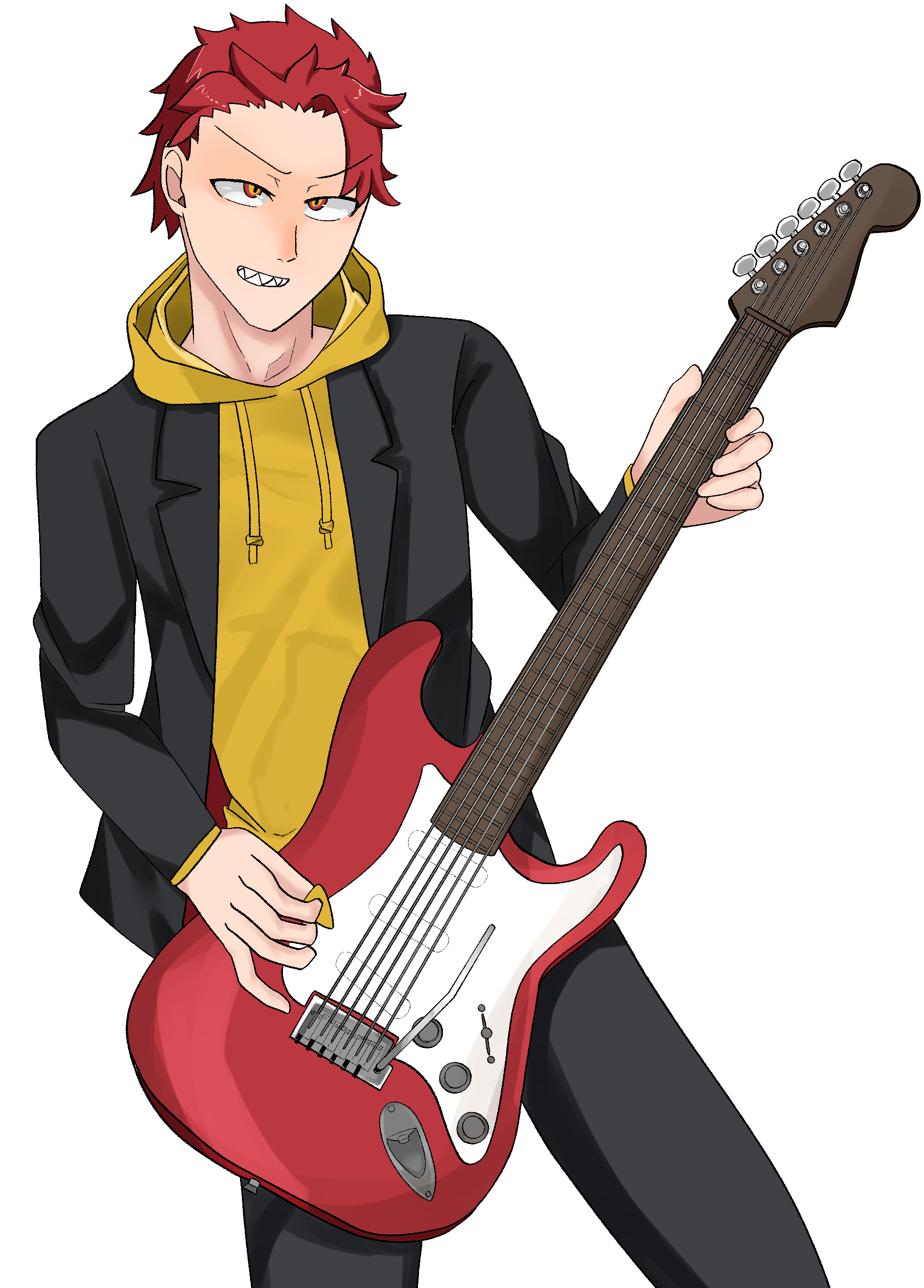 ブレザーの下にパーカーを着ており、ギターを持っている。