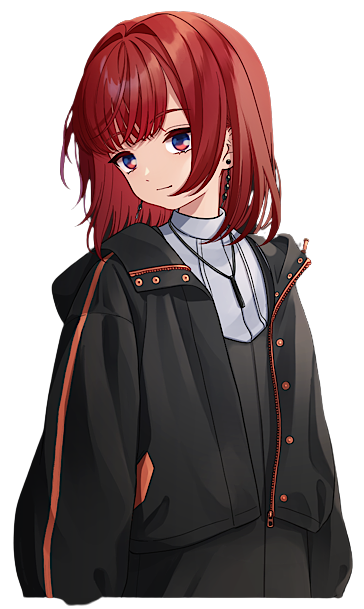 髪 少し跳ねっけのある髪質。肩までで揃えた赤髪のミディアムボブ。