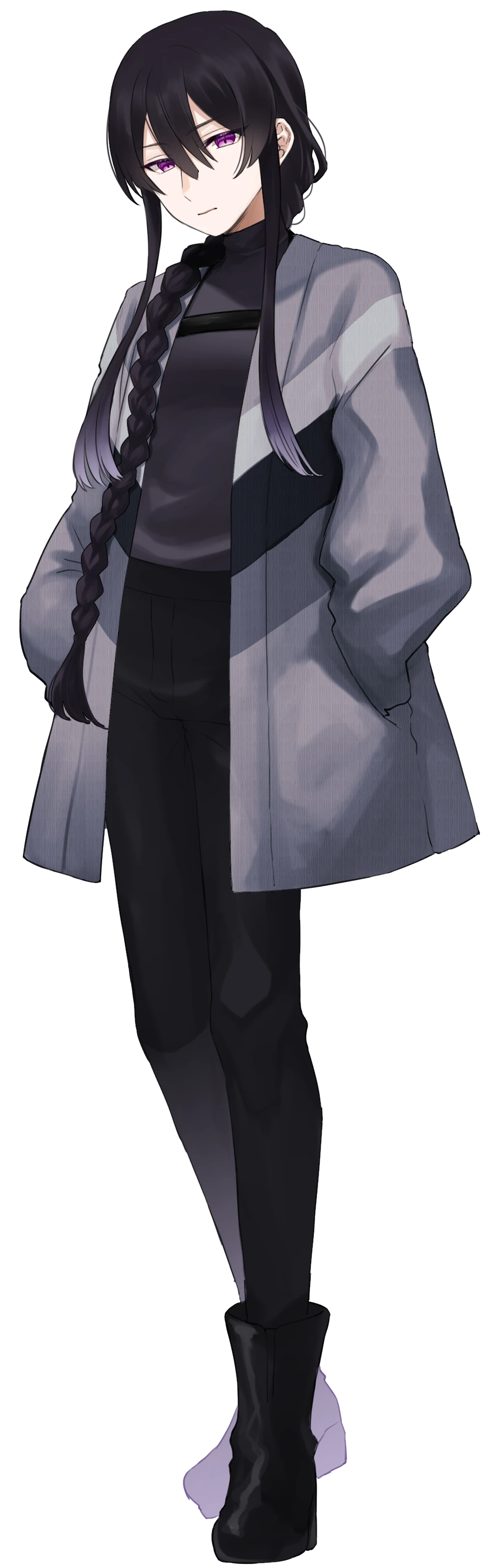 黒髪ポニテ長髪、マゼンタ系(紫寄り)の目の色