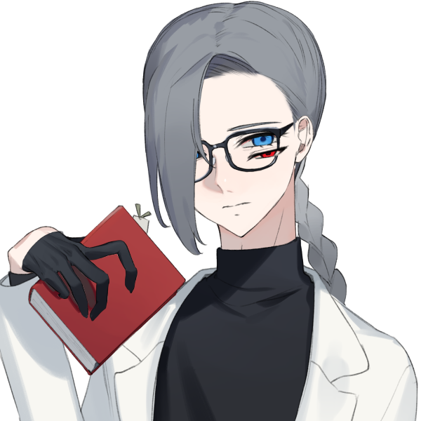 グレーの右目を隠した前髪、長い三つ編み。黒縁のメガネ。白い肌。高身長。
