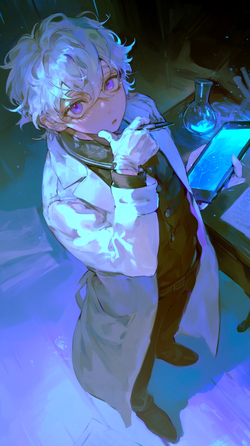 高校の制服の上に白衣を羽織っている。細身で中性的な雰囲気があり、大人びた印象だが、表情や仕草にはまだ幼さが残る。指先の動きが繊細で、何かを操作する仕草が目を引く。白衣のポケットにはタブレット端末やメモ、小さな試薬瓶がいくつも入っている。