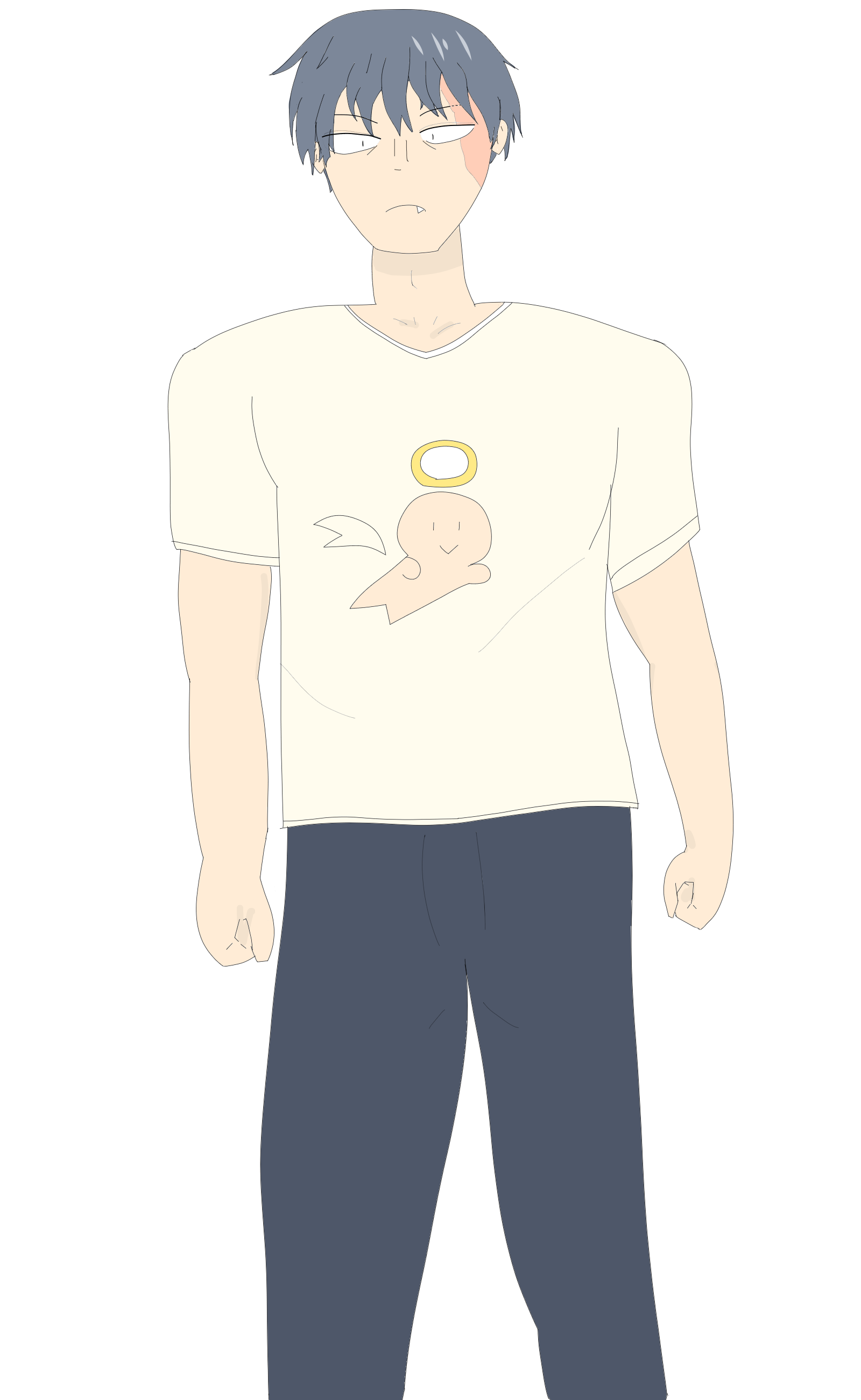 性格は温和で心配性。対人関係が苦手で初対面の人だと緊張して顔がこわばり、ひきつる顔に相手が怖がるといった悪循環があり友達がいない。怖がらせないように人とかかわるときは顔を隠すようにしている。お面かぶったりマスクしたり