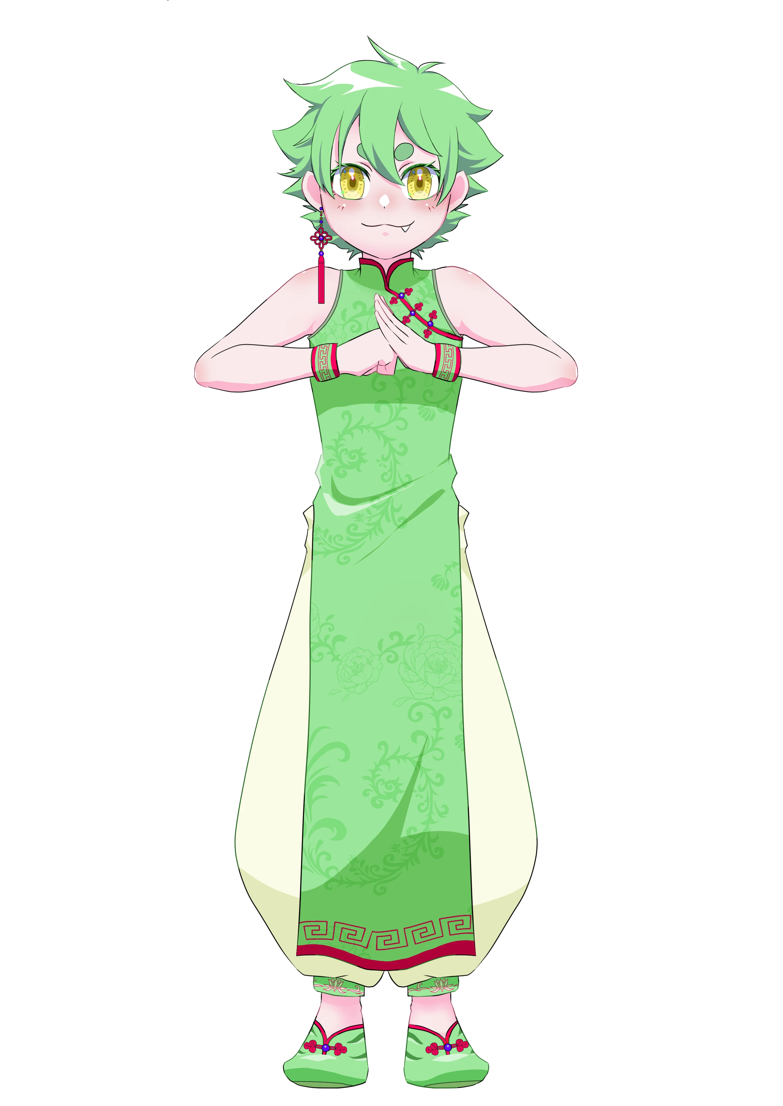 短髪でやや幼児体系。龍化時には角が生え、四肢は龍の爪や鱗に変わり、瞳孔は細長くなる。