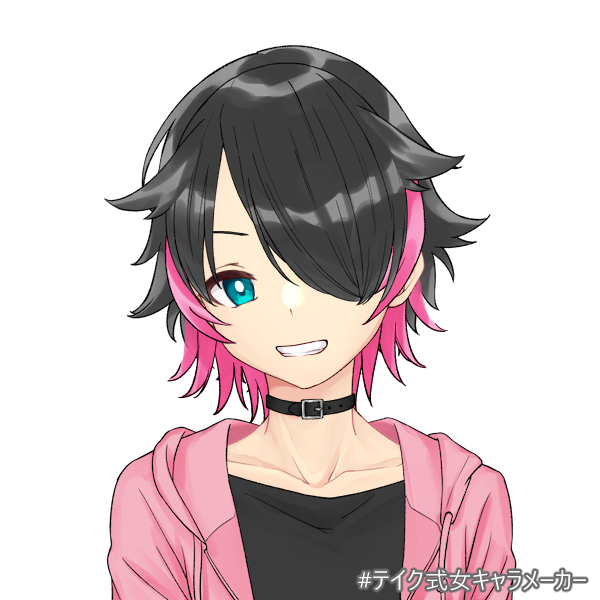 黒とピンクのツートンに、ハネ癖のある髪の毛が特徴。片目がやや隠れる長さ。口調や顔立ちも相まって少しボーイッシュ。フード付きの上着を愛用している。