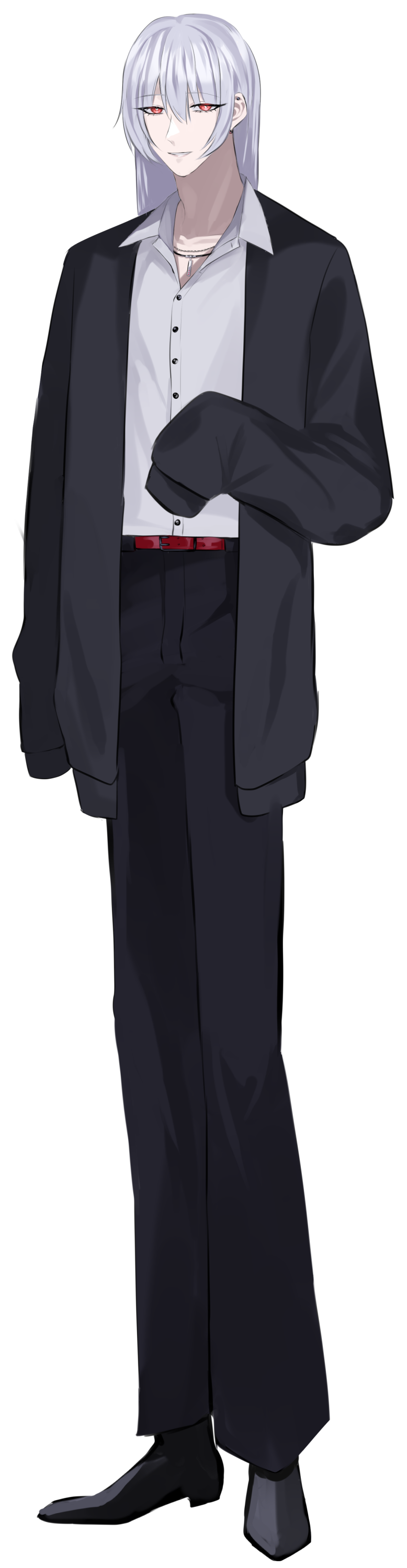 ストレートの銀髪の長髪に、赤目が特徴の中性的な青年。