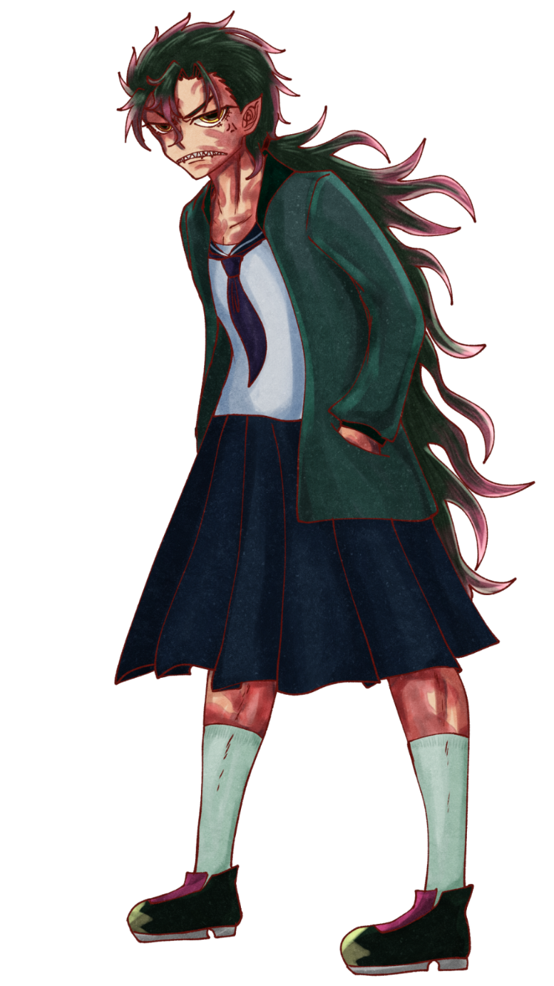 毛先が赤紫の緑髪と身体のほとんどにケロイドのような傷があるのが特徴的な少女(?)。背が高く、女子とは思えない筋肉質な体つきをしている。