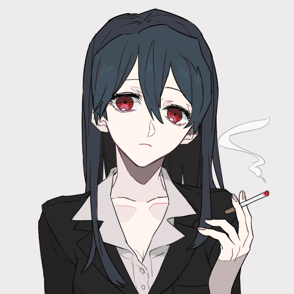 藍紫の髪、真紅の目、色白、スーツ姿。