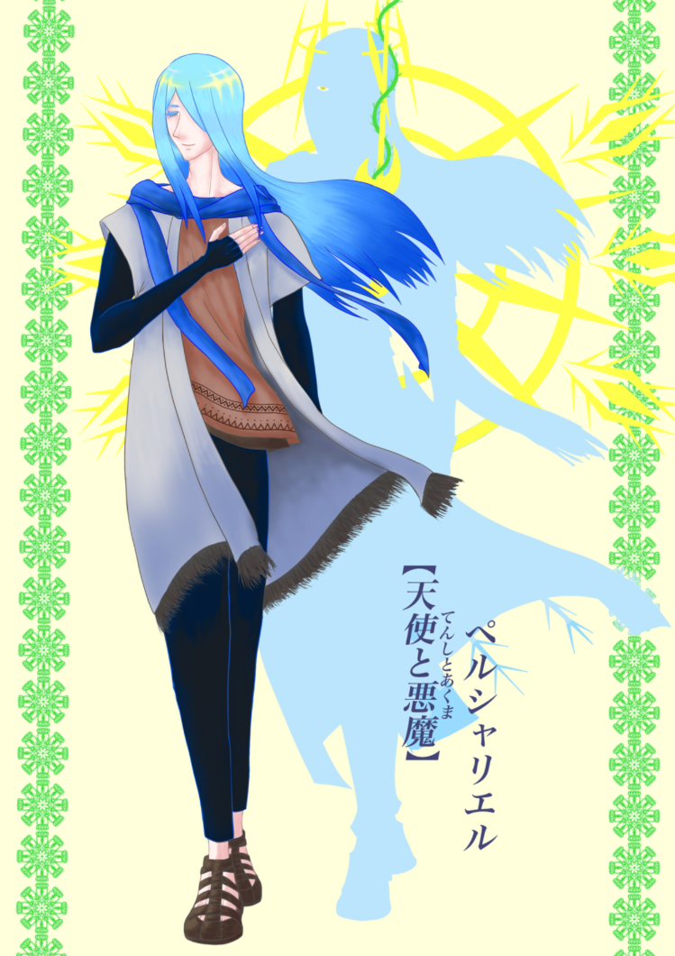 特徴:毛先が青く全体が水色の長髪、常に目を瞑っていて滅多に瞼を上げる事が無い(瞳の色は金色らしい)。見た目は中性的でまるで物語に出てくる旅人の様な服装をしている。首には水色のストールを巻いている。中性的な服装で過ごす事が特に多い。
