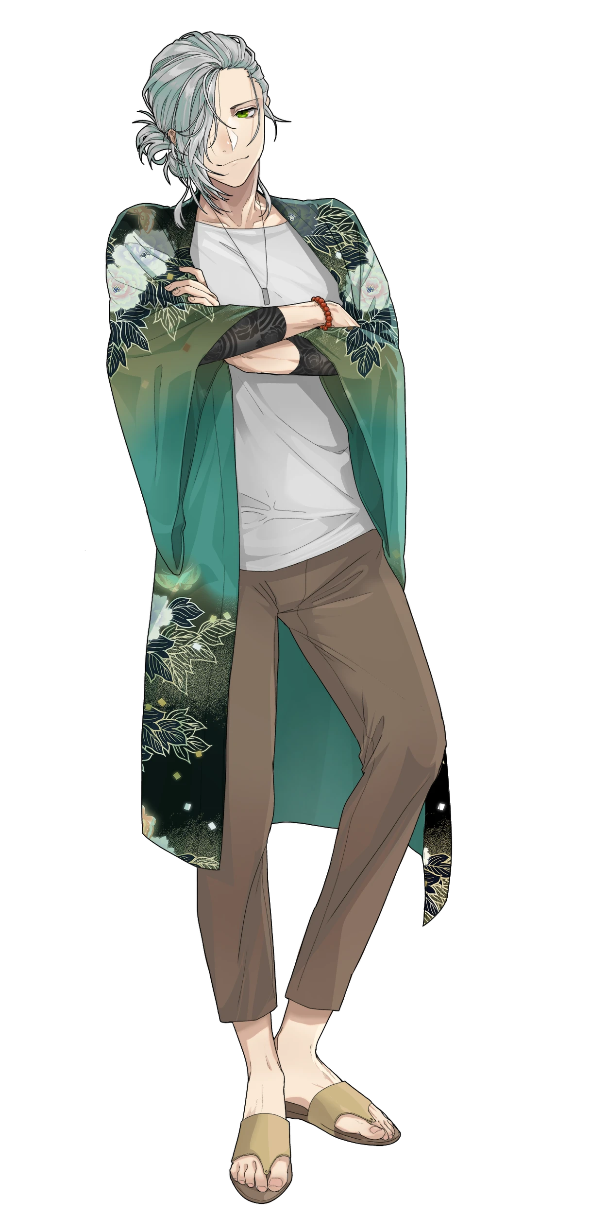 後ろをお団子に纏めた白髪と緑の瞳が特徴的。前髪を長く伸ばしており、顔の半分は隠れてしまっている。