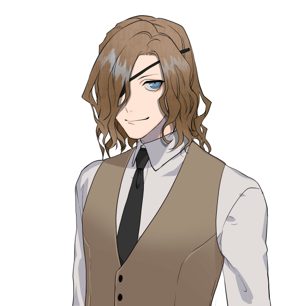 - 茶髪のロング、右目隠れに眼帯、ブラウンのベスト。