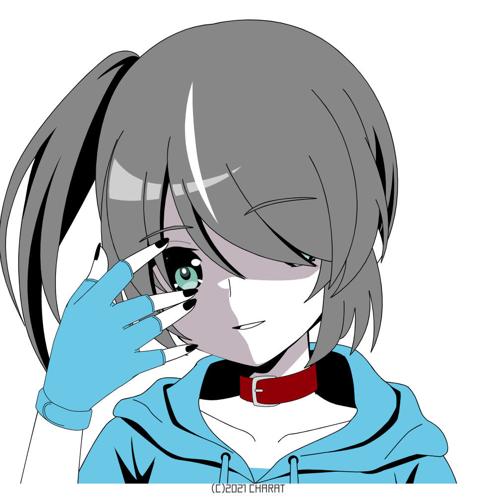 アシンメトリーな髪形と白い一房が印象的な青年。