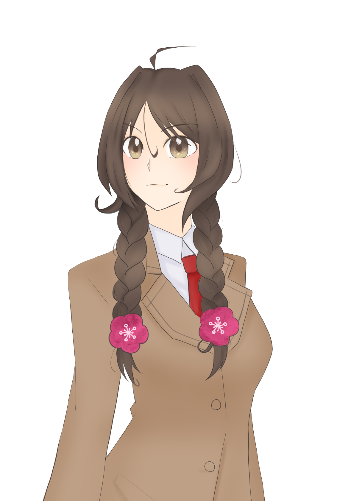 胸まである髪をおさげにしている