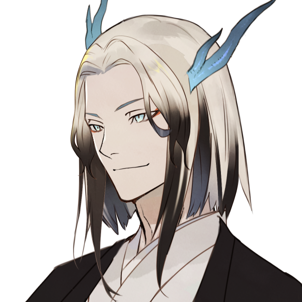 本霊は白色で毛先に黒色が混じる髪色であり、碧色のツノが生えているのが特徴。目元は分霊と同じ。