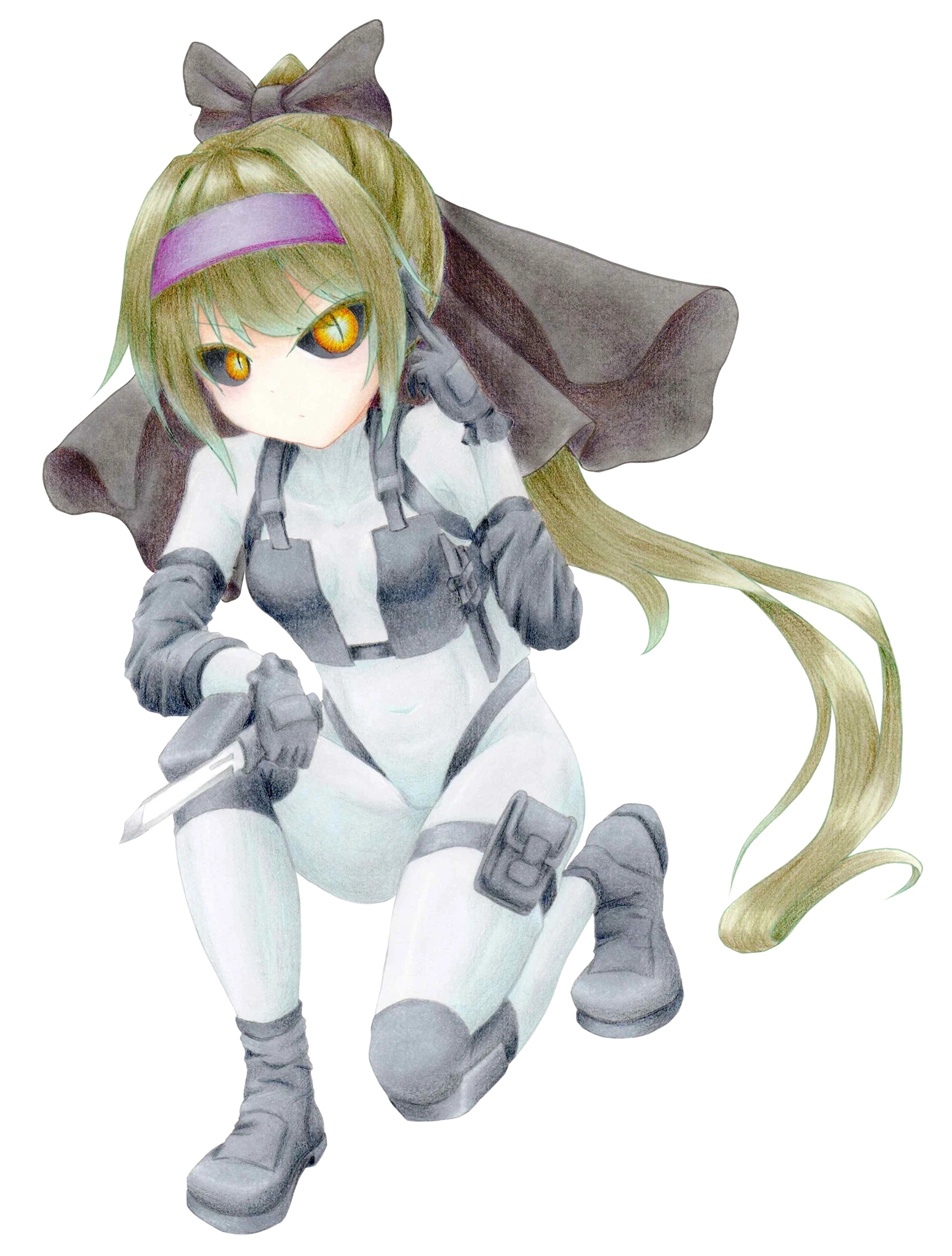 主に隠密系統の任をこなせるように育てられており、それに準じて装備もそれ系統でまとめられている。姿を隠せる光学迷彩服や、その補助かつ髪留めにもしているクロークがその最もな装備であり、必要最低限かつ現地調達で済ませて使いやすくするようにケースも取り付けられている。ちなみに基本正規の装備品を模した贋作であるため、彼女にとって最も馴染み、使いやすいように手が加えられている。ただしそれでも機能を落とさないことを最前提にしているため限度があり、着続けているとだいぶ暑いらしい。
