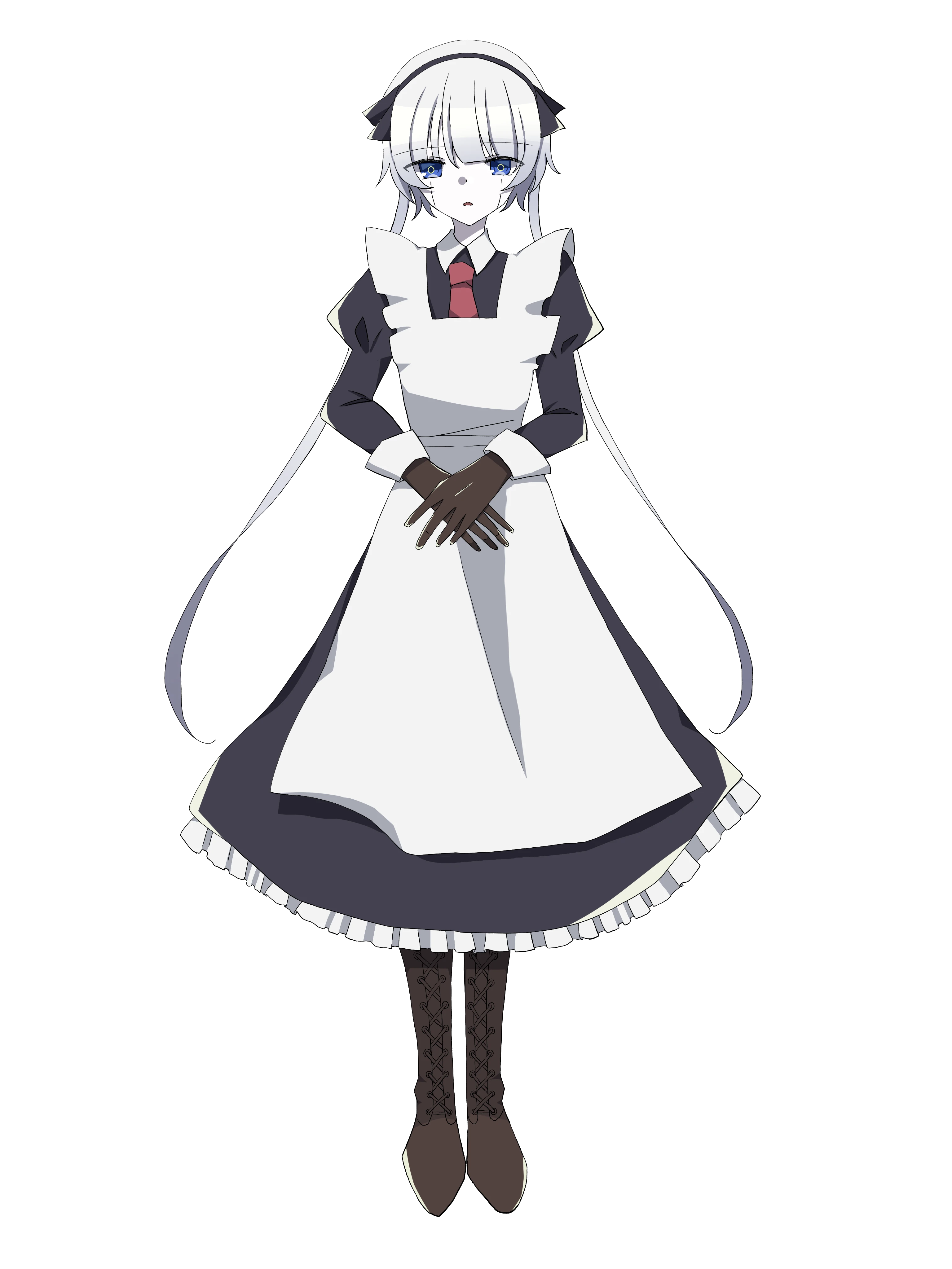 マシンガンを隠すためロングスカート、機械っぽい脚を隠すためのロングブーツを身に着けている。