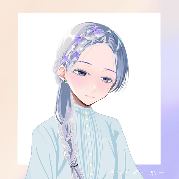 - 長い銀髪を三つ編みにして横に流している。