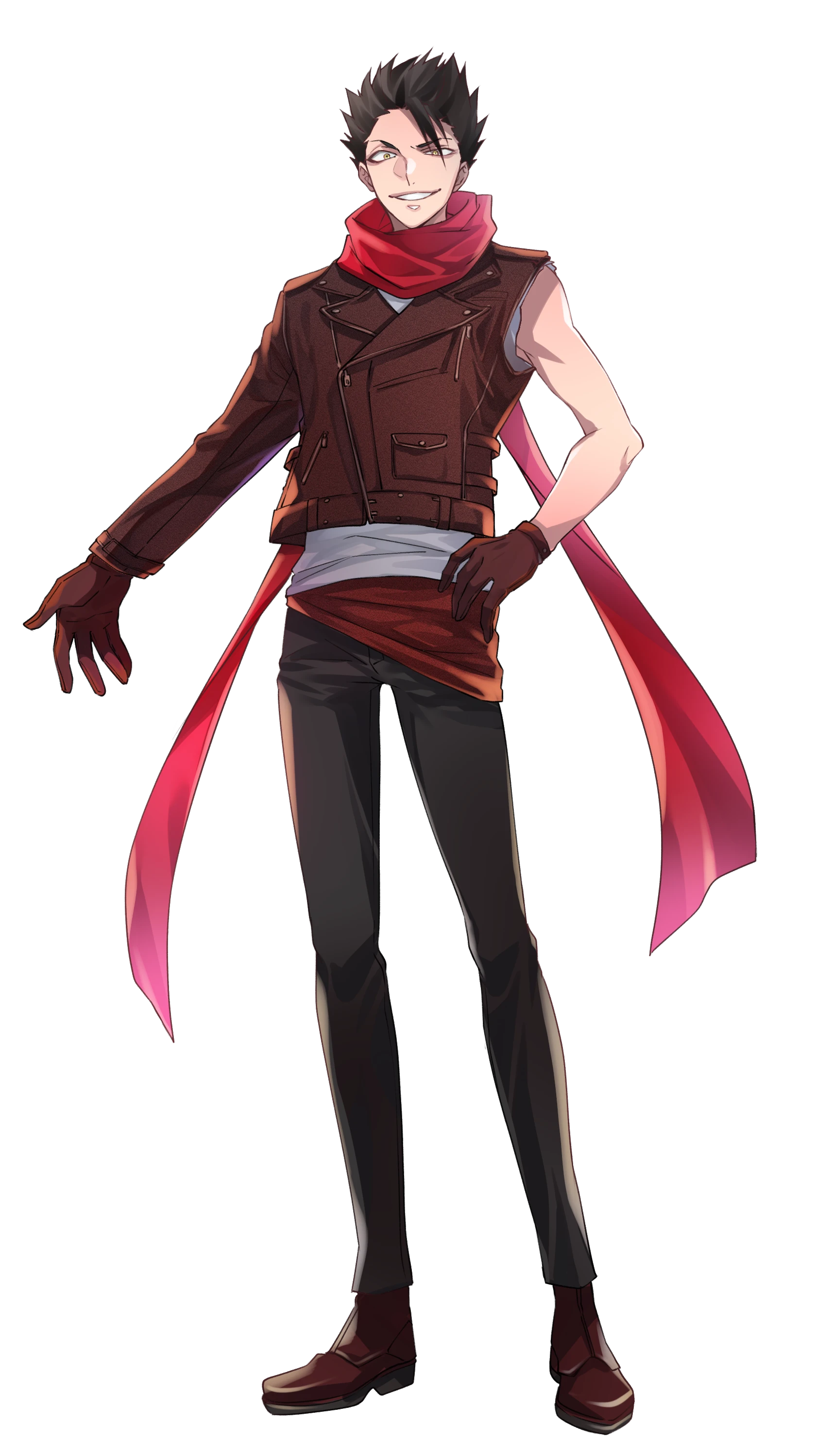 服装:ライダージャケット(左腕だけ切れてる)、インナーシャツ(左腕だけ切れてる)、動きやすい服装のイメージ