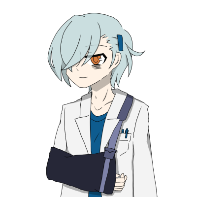 雑にヘアピンで片側の髪を留めて、右腕をギプスサポータ-で吊っている、右腕は怪我をしているわけではない(後述)