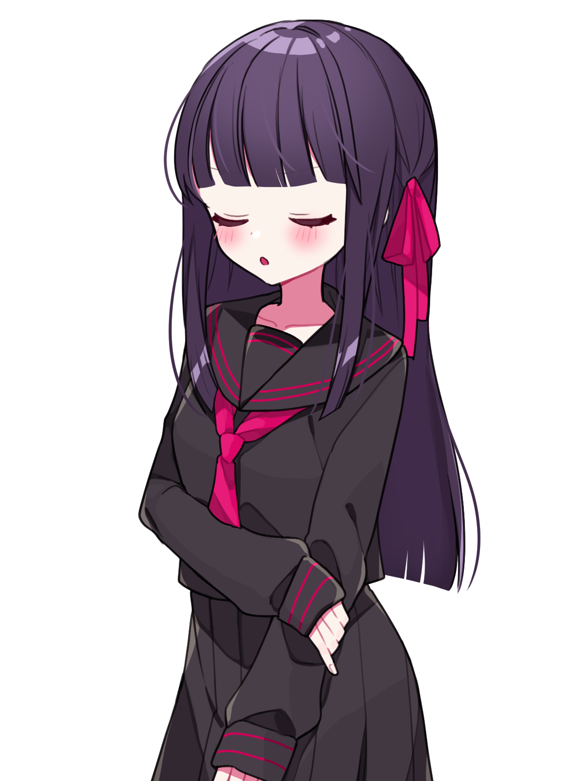 黒髪ロングを赤いリボンで留めている。