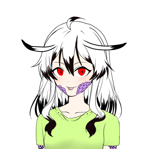 真っ赤な目には基本的にハイライトが入らず、瞳孔は蛇らしいもの。舌も生まれつきのスプリットタン。だって蛇だもの。