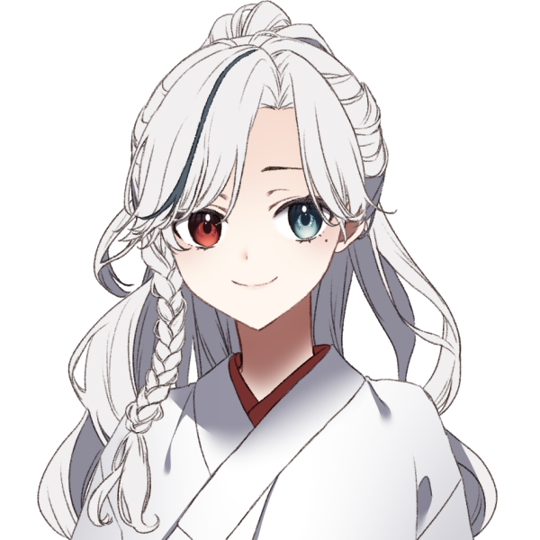 塗り忘れたかのように真っ白で、ポニーテールに束ねられた長い髪。左は大海あるいは晴天を、右は鮮血あるいは皆既月食を思わせる金銀妖瞳。一片の汚れもない、陶器のように艷やかな肌。着用した着物は柄すら無く死装束と見紛う程の純白で、前髪にある黒い一房と色の違う両眼、それと内側から覗く赤い襟だけが彼女の中で色を主張し、より鮮烈に、しかし美しく際立っている。