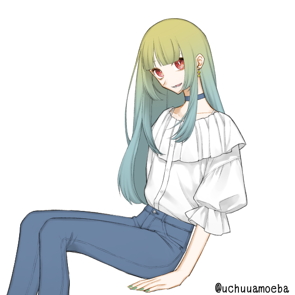 黄緑の腰まである髪に赤目。格好はメンズレディースどっちも着る