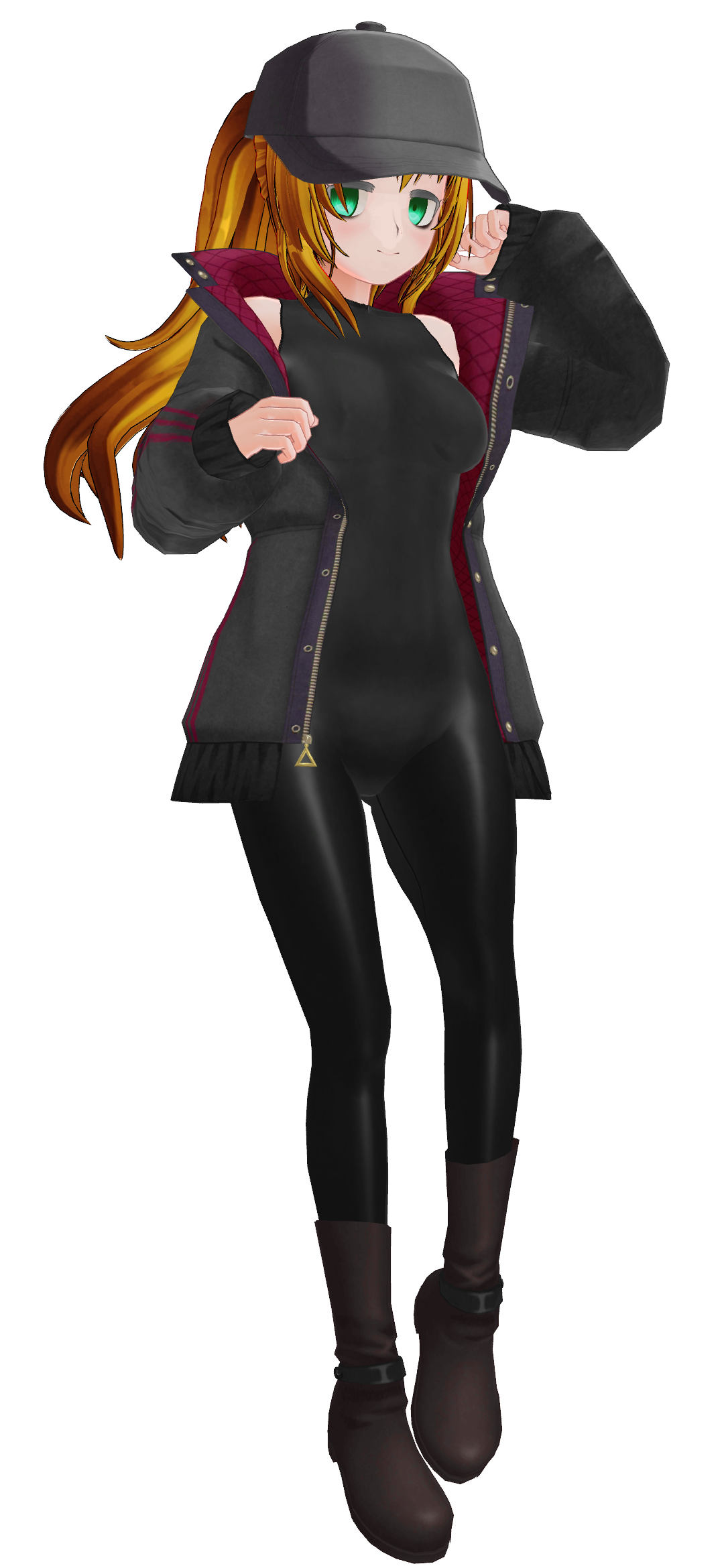 金髪を上の方でオーバーポニーにまとめ、キャップを被った少女。