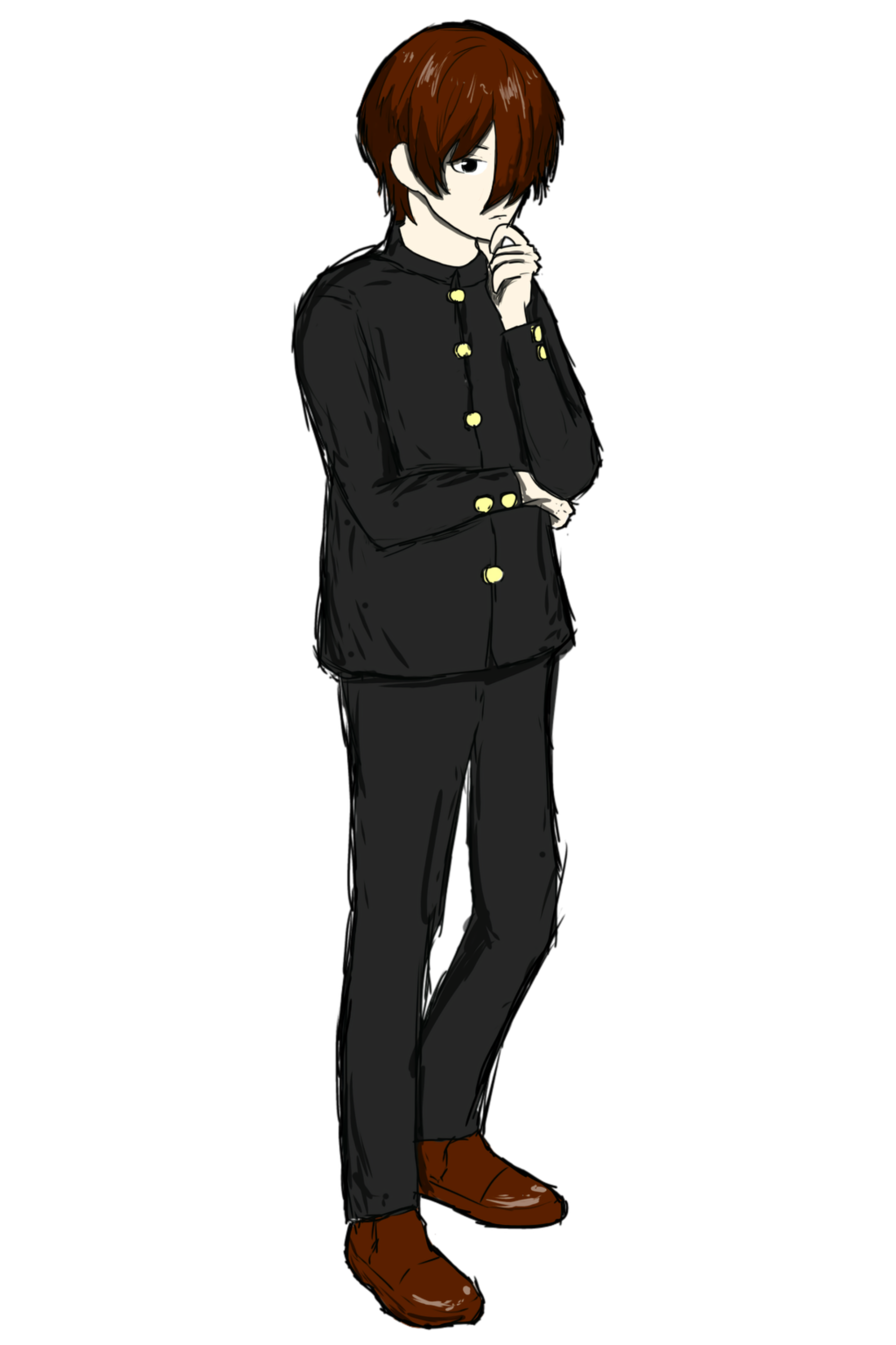 黒に近い焦げ茶色の髪型。前髪は左目隠れの片目。耳元は少し長め。瞳は切れ長よりだが伏し目がち。黒に見えるが僅かに赤色を帯びている。体型はやや細身、姿勢は猫背気味で教室で気配を消して目立たず座っている。制服はきちんと着るがとにかく地味。私服ではフーディーやロングカーディガンなど。黒、紺、灰色を基調とした色が多い。