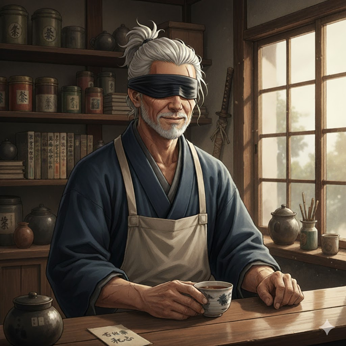 40歳代(?調整可)の頃、苛烈な戦いの人生の中で遂に目への負傷で光を失う。