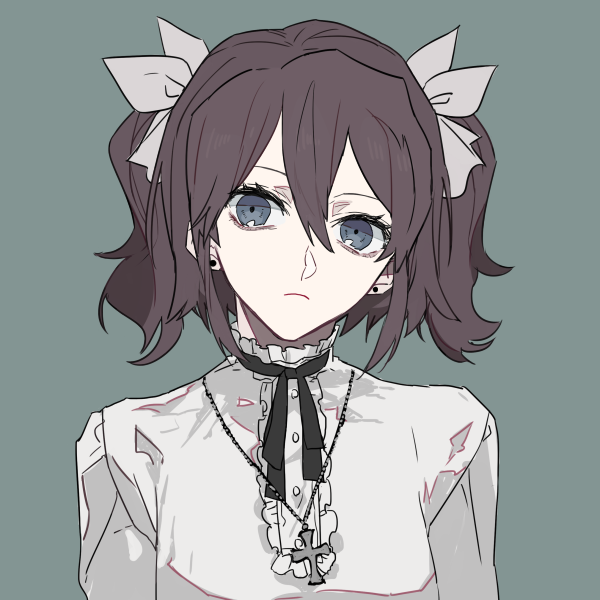 フリル襟の白ブラウスに、膝丈の黒いフレアスカート。白いリボンで両側の髪を結んでおり、首からロザリアを下げている。そして右太ももに拳銃を隠し持っている。