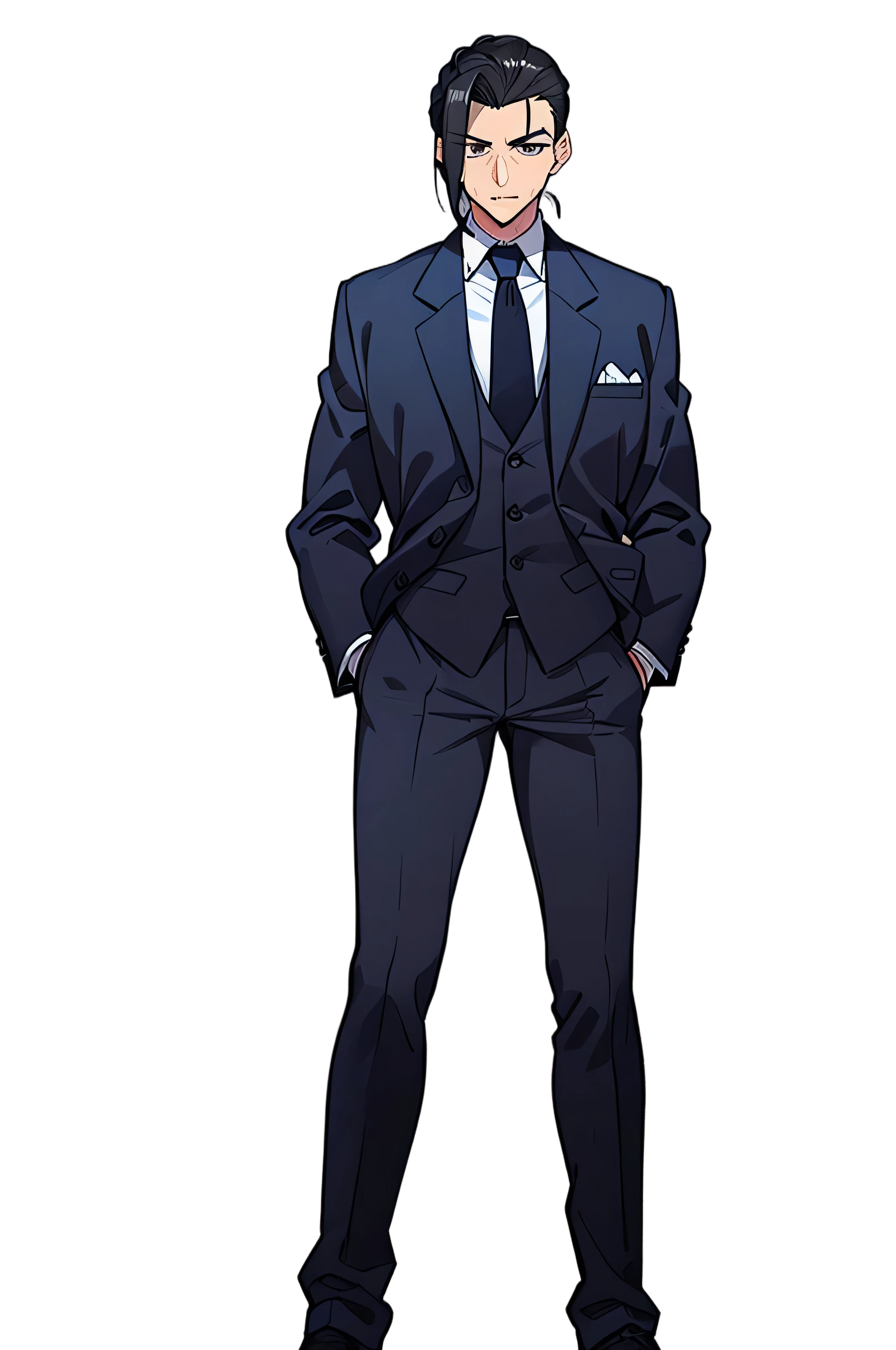 丁寧にオールバックにまとめられた黒髪と、彫が深く鋭い眼光を放つ切れ目が特徴。