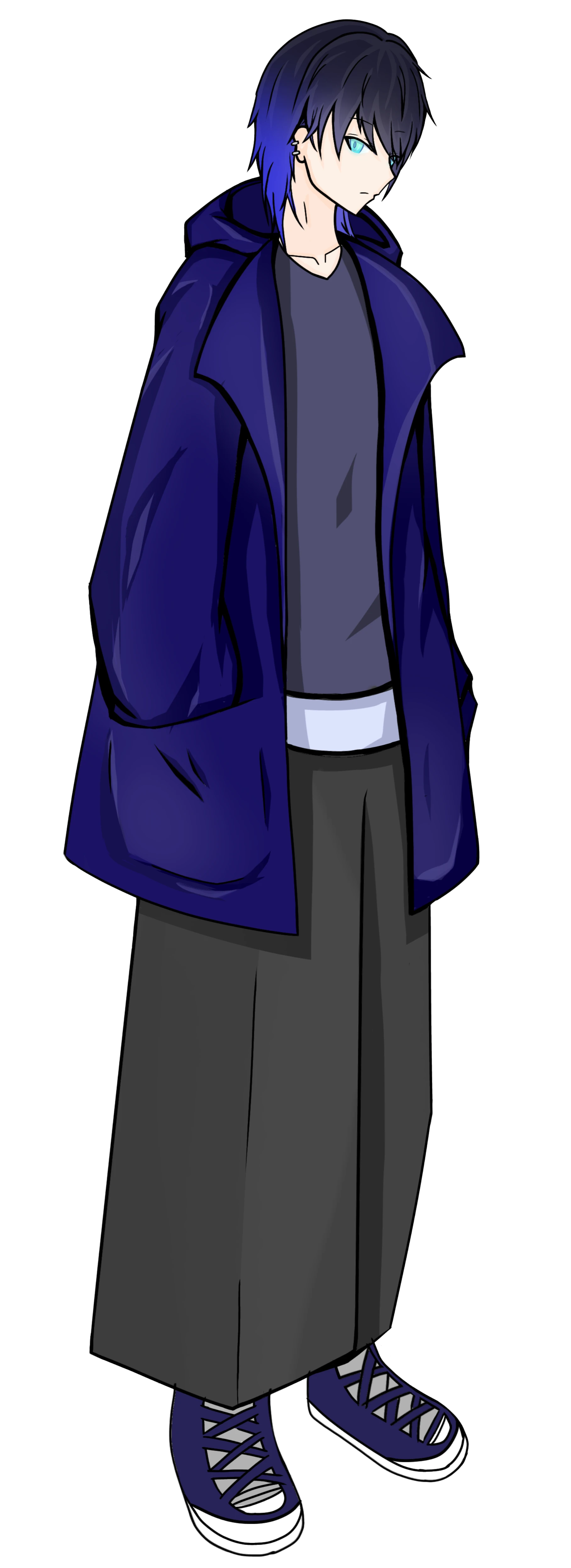 黒髪+青インナーカラー。襟足は長め。ピアスあり。全体的にチンピラっぽくてパッと見怖い。背が同年代よりちょい高め。顔はだいぶいい。