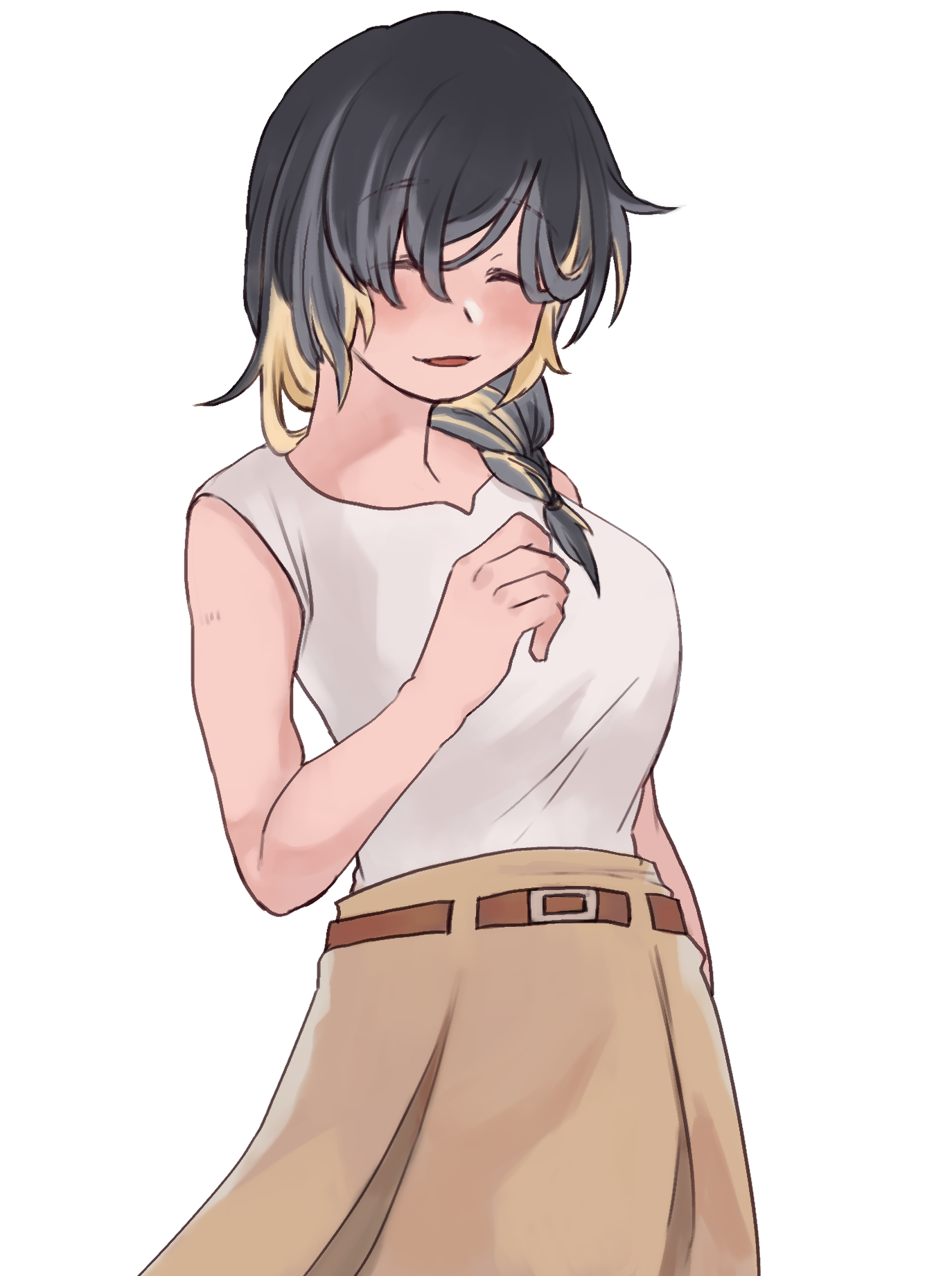 方目隠れの黒髪、黄色のインナーカラーが特徴的