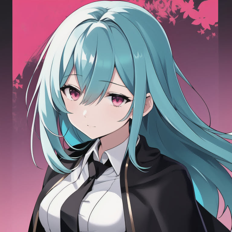 シアンのロングヘアにピンク色の瞳を持つ女性。