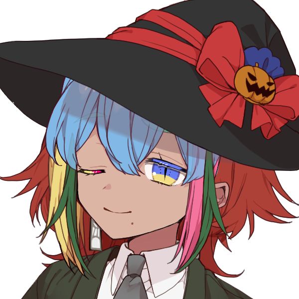 容姿:散乱した光のような髪と虹の瞳を持つ長身痩躯の男性。魔法帽にスーツという不審者ルックス。