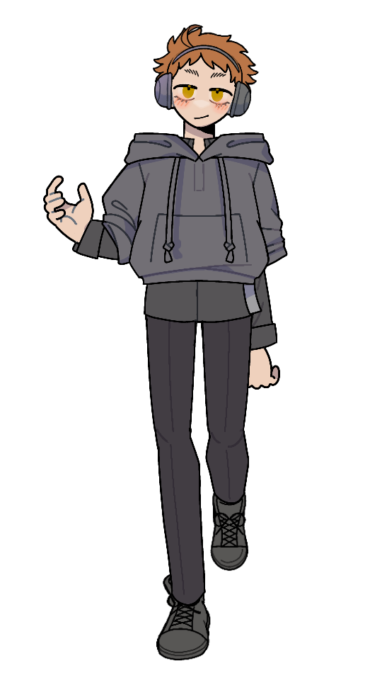 ヘッドフォンは本人なりのキャラ付け。趣味は漫画やアニメ(ジャンプ系)の視聴と音楽鑑賞(ロックやメタル)、あとたまに人助け。