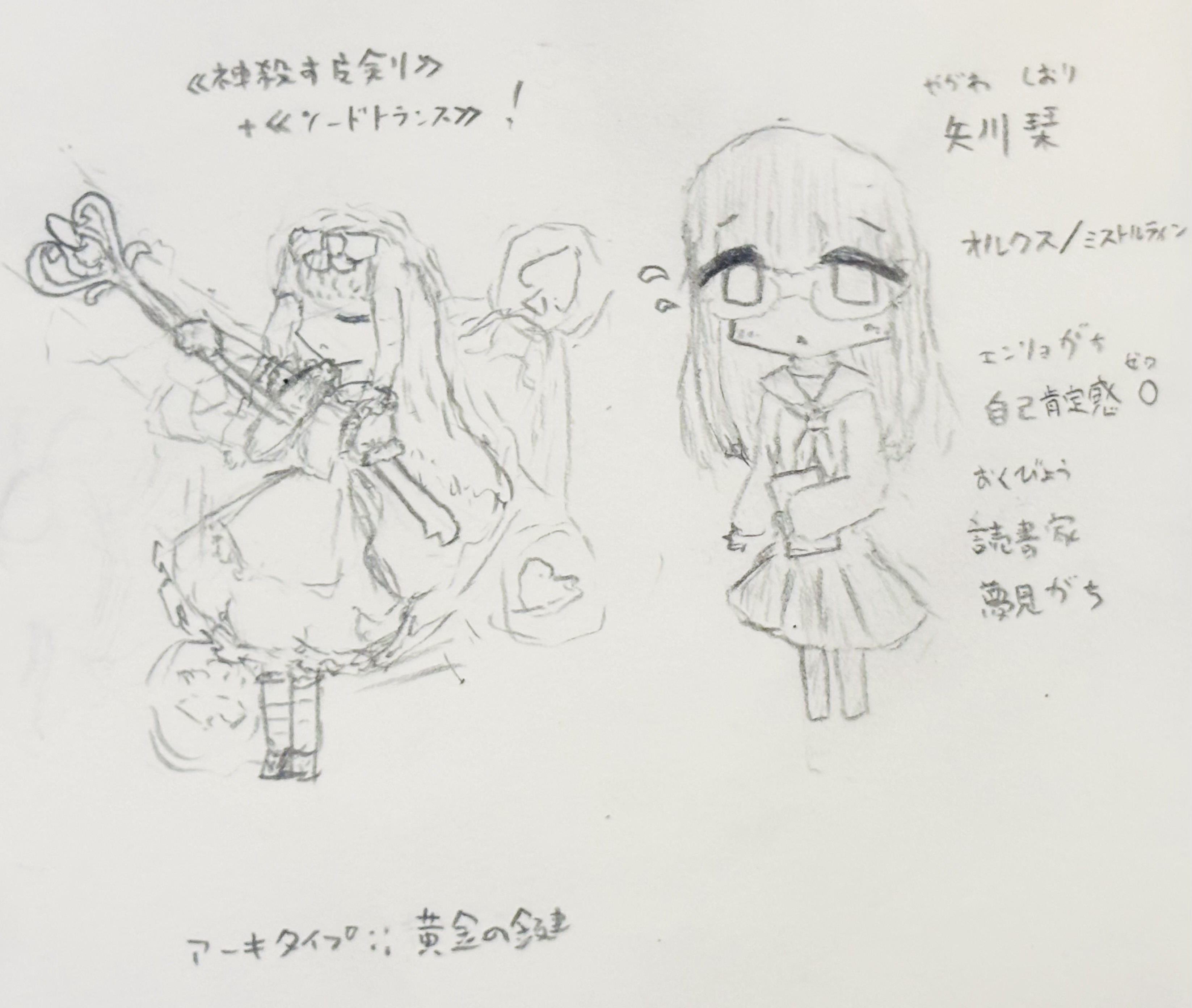 | Archetype::黄金の鍵 | 白兵 アーキタイプ | 〈白兵〉 | -2 | 12(15) | 5 | 至近 | 金色に輝く大きな鍵。 少女の心から開花した可能性。彼女が自分自身の物語を歩もうとする自我の具現化。 (「アーキタイプ:両手武器」相当品。両手持ち) |