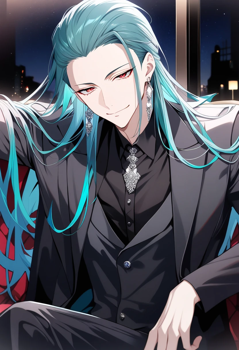 - 晴れた空色に近い青色。オールバックに長い髪を下ろしている