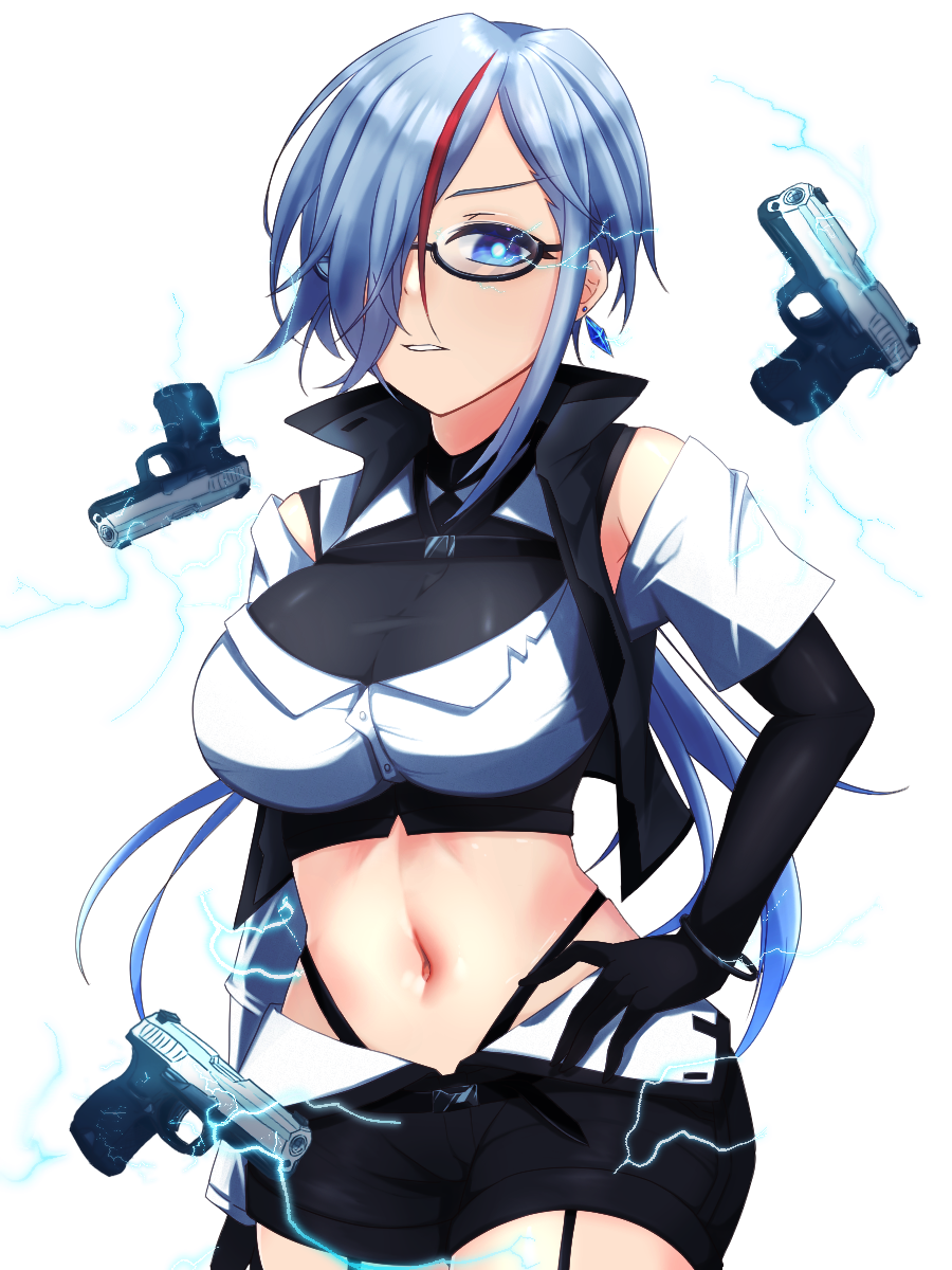 赤メッシュの入ったメカクレ銀髪の長身眼鏡ウーマン。