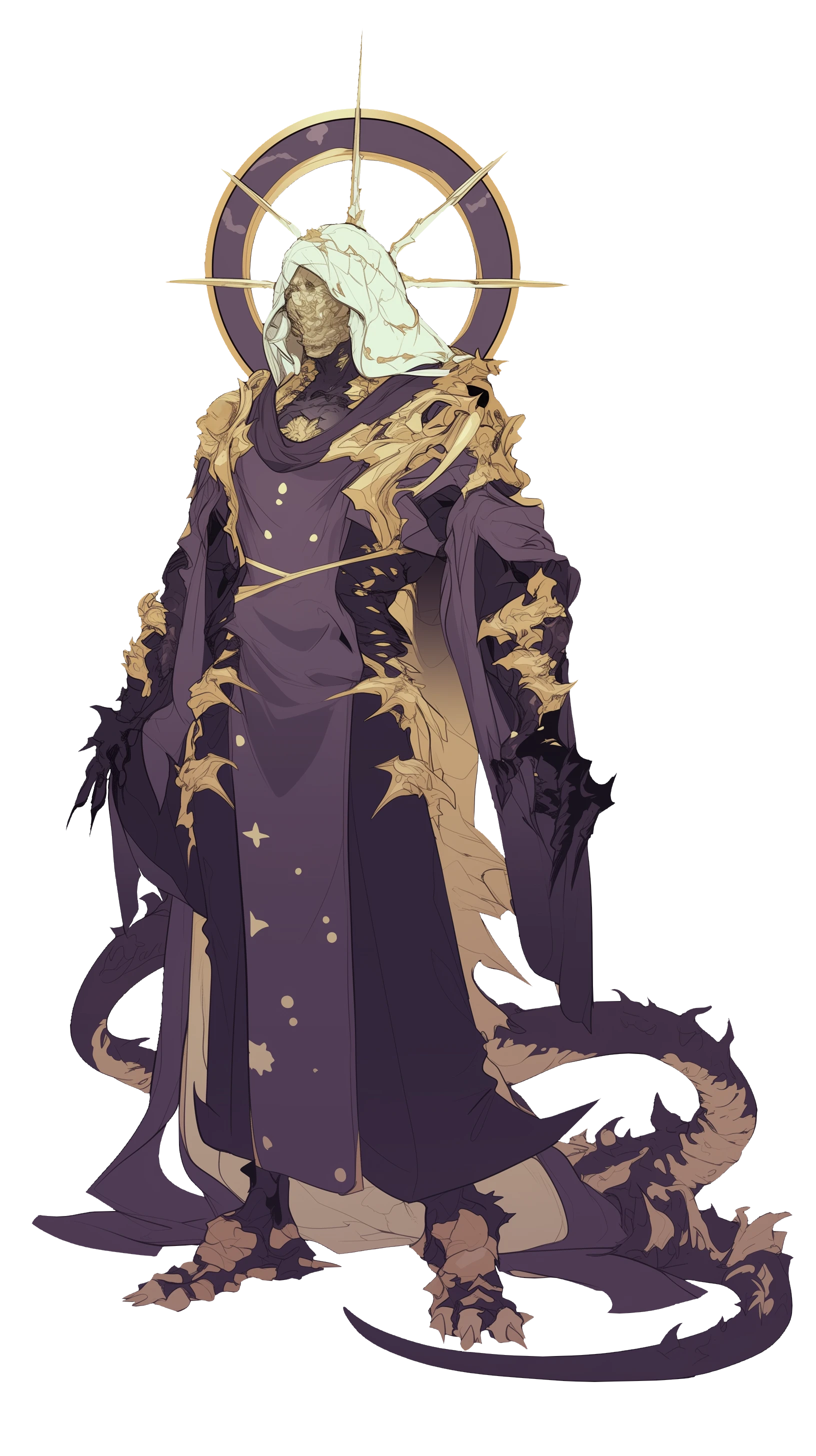 枯れ枝や枯葉が服の上から絡みついている、頭に光輪が着いている。