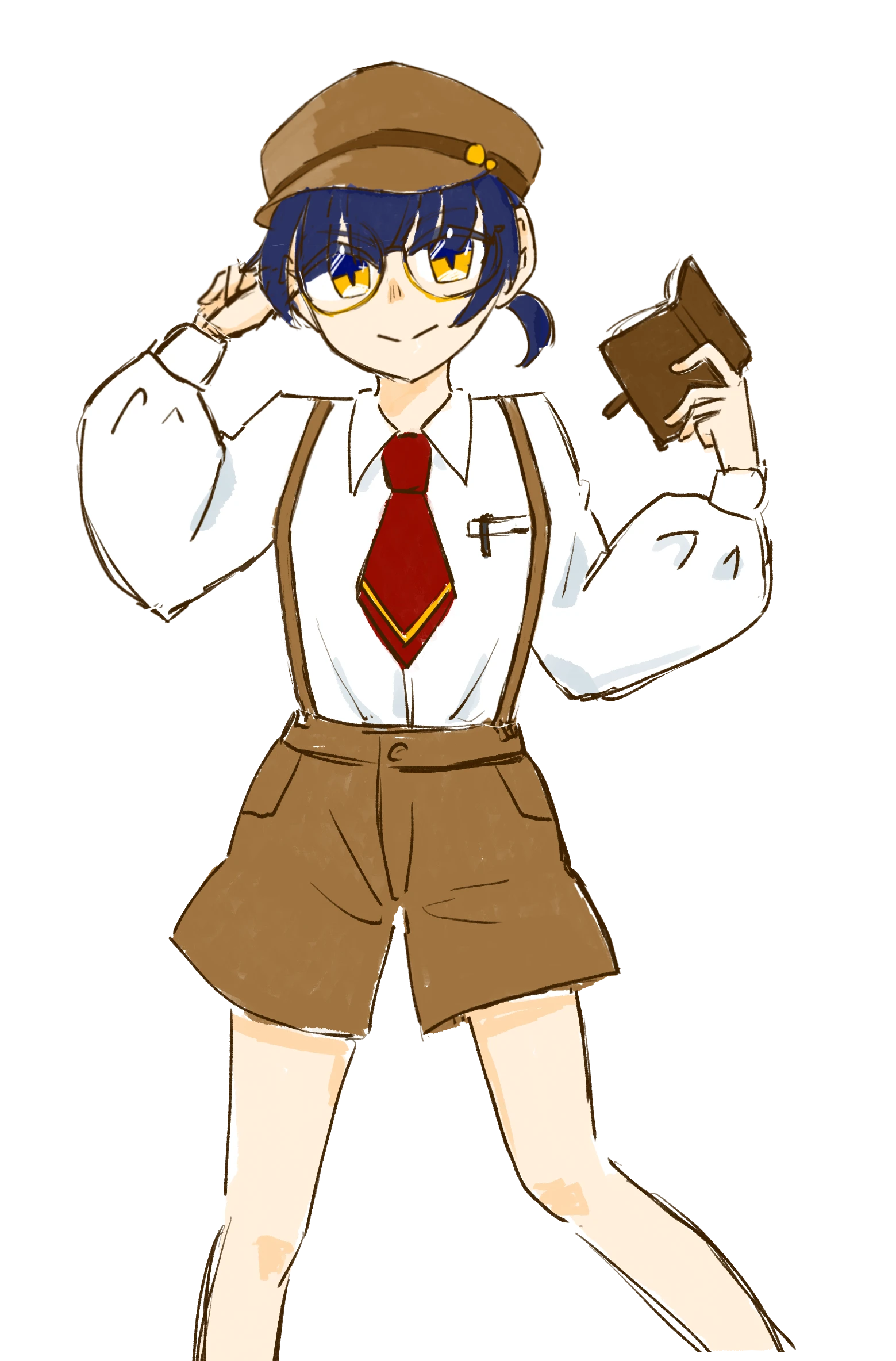 ネクタイ、キャスケット帽、大きな丸メガネが特徴の、真面目で努力家な女の子。身長は小さい。