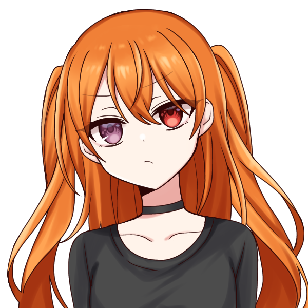 オレンジのツーサイドアップ。オッドアイで左目が不思議なまでに赤い。