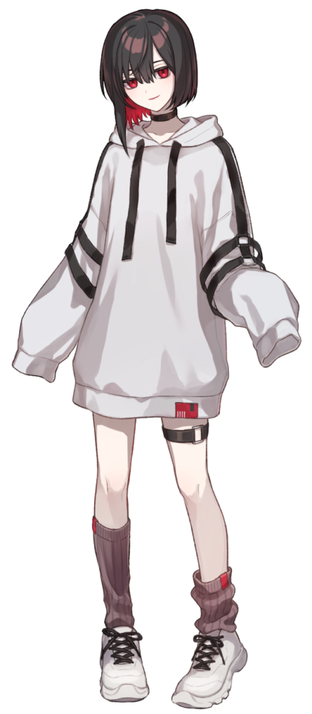 中性的な顔立ちをしている。黒髪に赤のインナーカラー。パーカーなどの体のラインがあまり出ない服を着用することが多い。