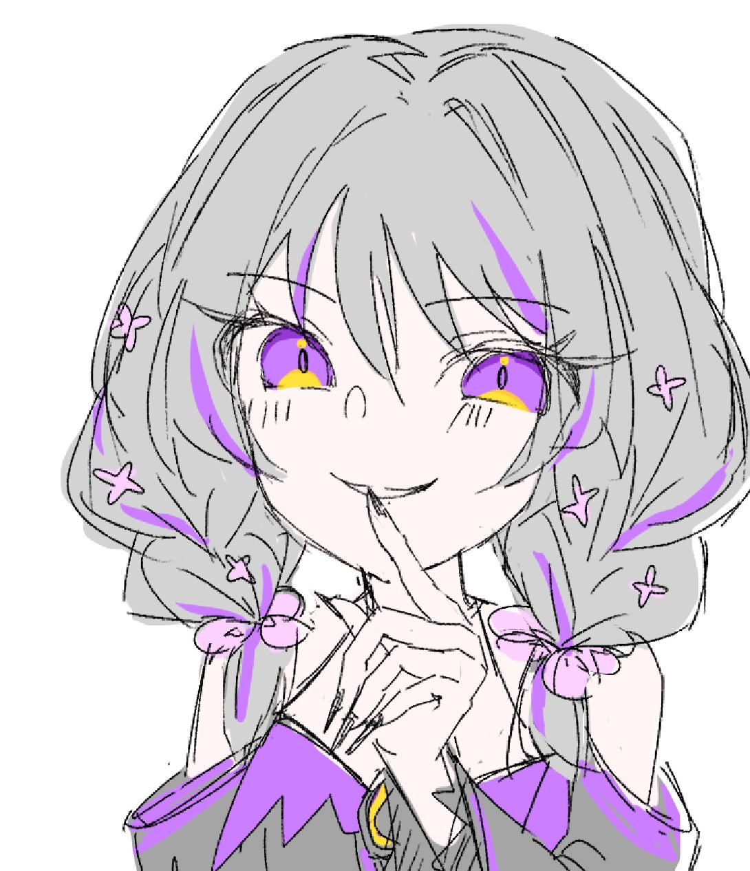 一部が紫色など、暗い色が入った灰色〜白色の髪の三つ編み。髪の毛の所々に何かの花を模した髪飾りを付けている。