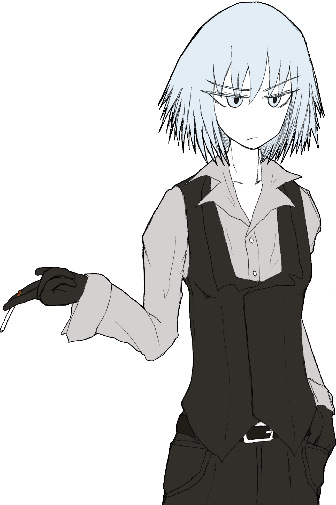 男装をしている銀髪の女性。