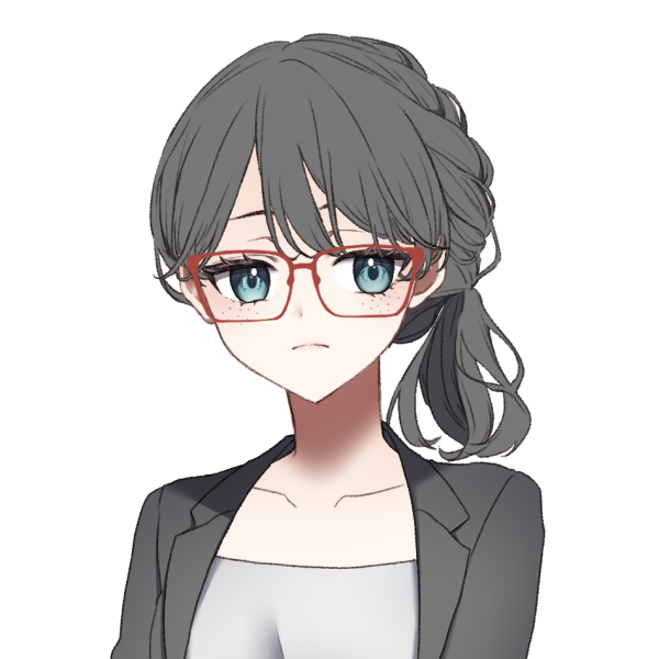 スーツ、ポニーテール、度の低い赤いメガネ