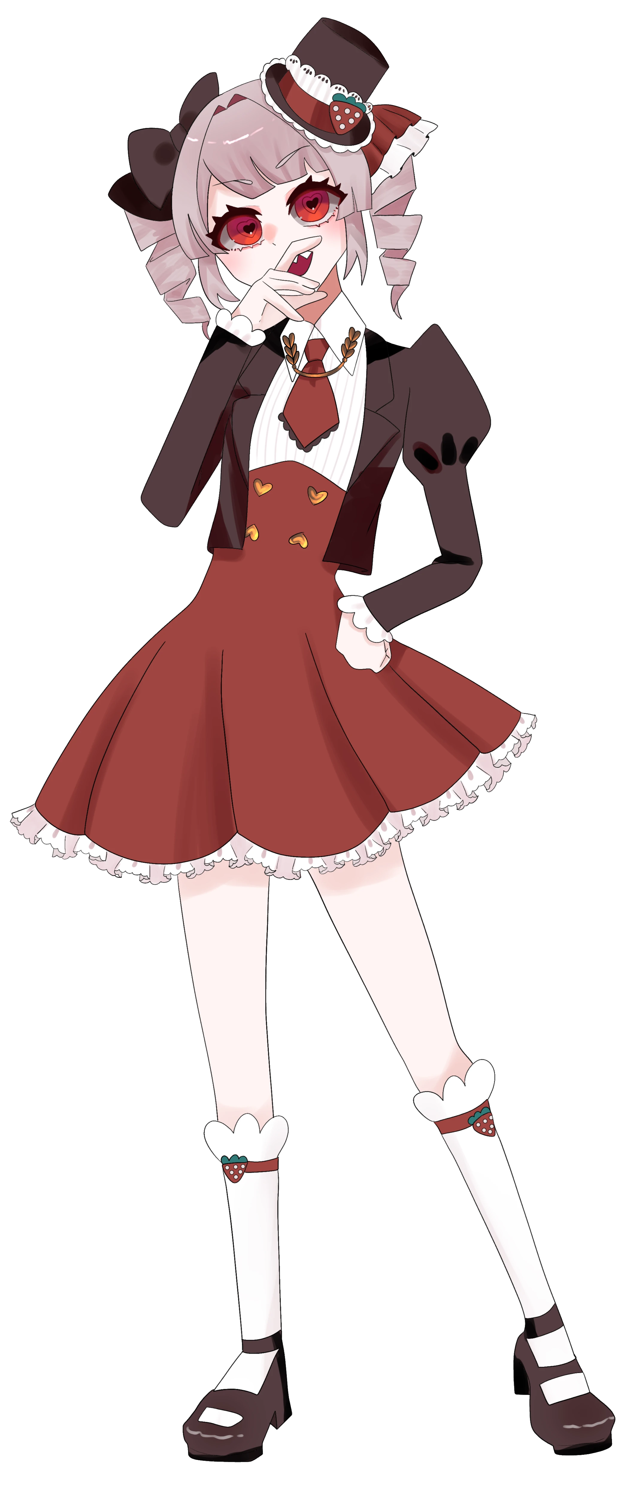 ピンクブラウンのツインドリル。赤い目。茶色の上着に赤いスカートのロリータ。