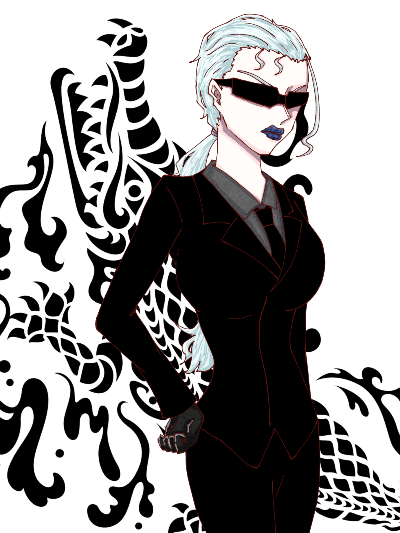 常にスーツに身を包み、サングラスで顔を隠し、氷のように固まって動かない表情筋を持つ長身の女性。余計なことは話さず、過去や経歴は不明。CNは黒鰐だが、本来の名を知るものもいない。