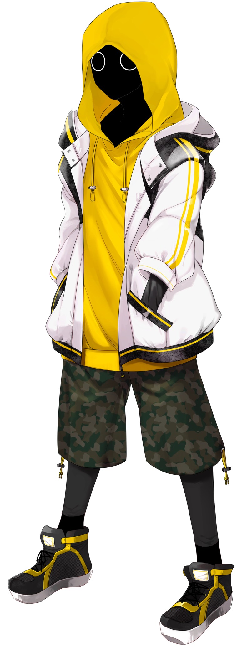 目深に被ったフードの下から素顔を窺うことはできず、影の中で双眸だけがくっきりと見える。これは微力の幻覚物質を無自覚に常時放出しているためで、相対した人物には「そう見えている」だけで、写真などで素顔を確認することができる。本人の意思でコントロールできないらしく、素顔を認識させない以上の効果を発揮しない。
