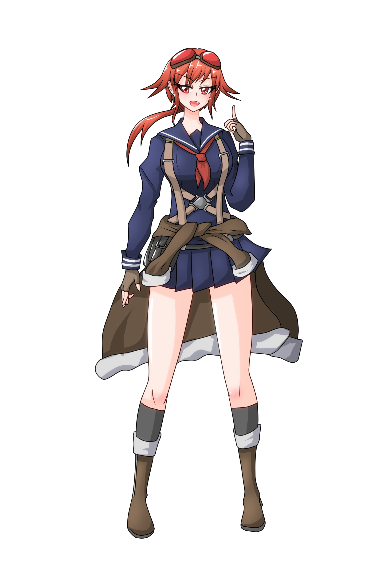 飛行服を腰に巻き、ゴーグルとベルトを制服と一緒に身に着けている。